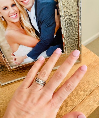 Harry added a band to my wedding rings for our anniversary- to represent 5 years of marriage & our first baby!