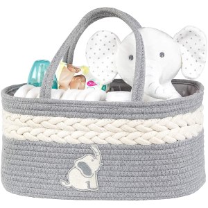 You can never have too many baskets like this to store baby items!! This diaper caddy can be used on a changing table, in a closet, or in another room. In the nursery, I keep diaper changing materials in a dresser drawer right under the changing pad. I use this diaper caddy in our room since Brewer currently sleeps in a bassinet in our room. I keep it stocked with diapers, wipes, burp cloth, pacis, etc. and it stays right by the bassinet. It makes life easier so I do not have to walk to the nursery every time I need something at night and it also keeps things organized.