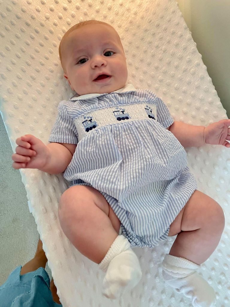 -He’s such a smiley, happy baby! When he’s in a crowd of people he can turn into a mood, lol! He just gets quiet and no more smiling- not necessarily fussy!
