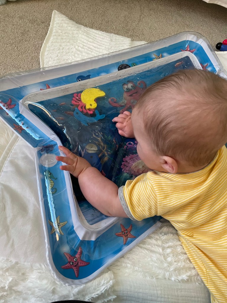 Brewer still loves his water mat and he holds his head up super well these days!