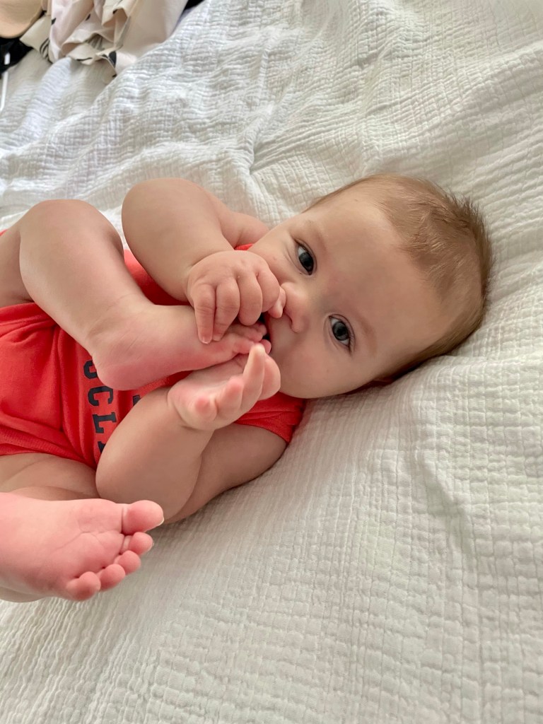 He learned a new trick this month- how to put his foot in his mouth! lolololol