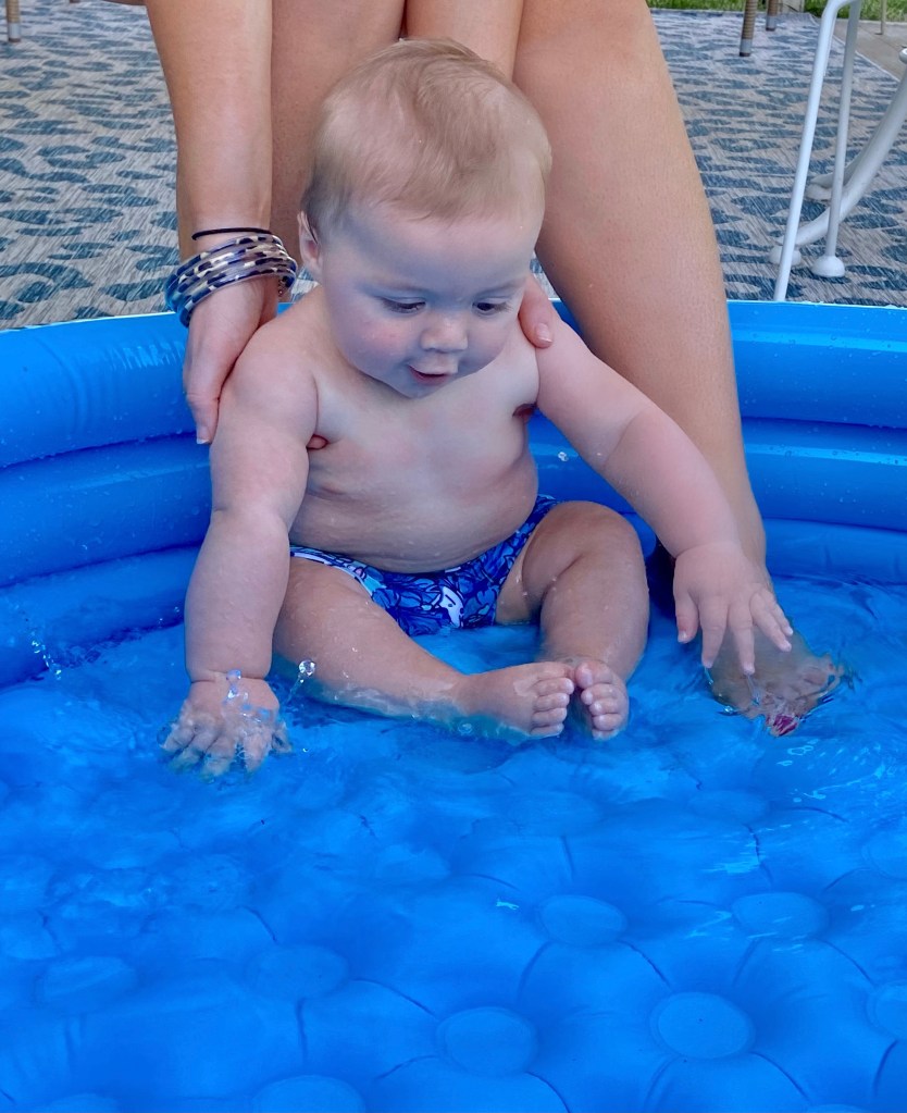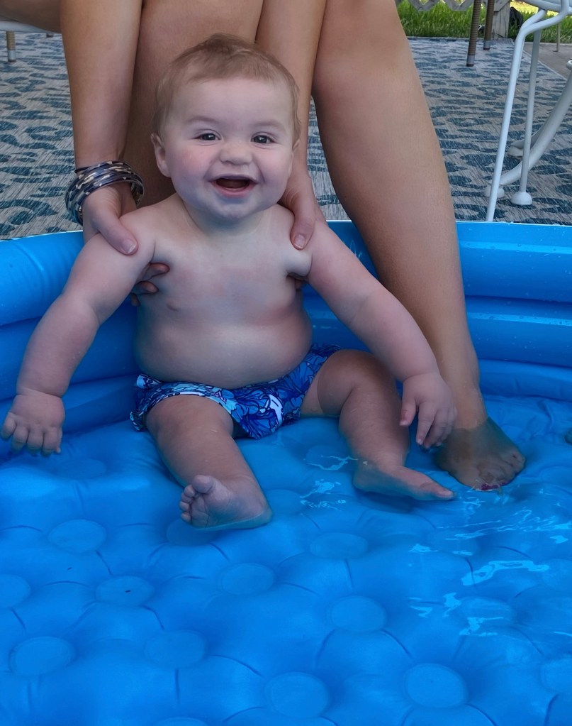 He also learned to splish and splash in his pool this month!
