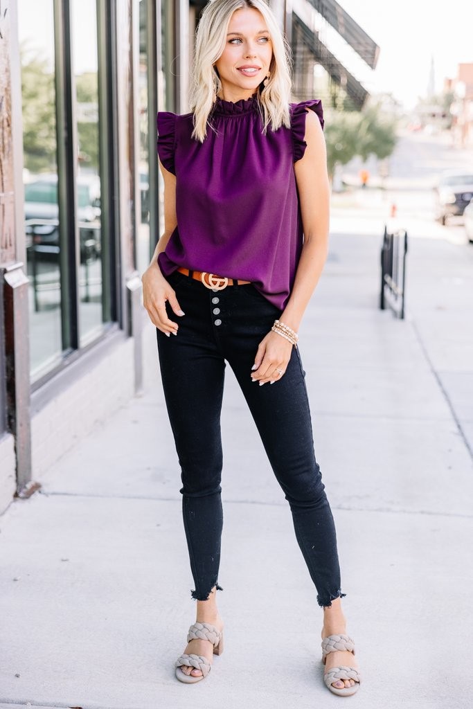 How cute is this plum top?! My family are big LSU fans! I thought this top would be so fun for football Saturday. I also just love this color for fall. It adds a great pop of color to your wardrobe. The ruffles are my favorite! So fun!! It’s a great transitional piece and it comes in lots of colors!