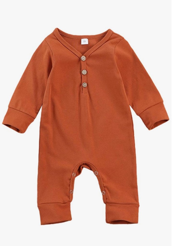 This is another great, “play outfit” from Amazon! It’s only $13.99. I bought it in this burnt orange color and a soft blue color. During the summer months, Brewer wore a lot of short/ short sleeve rompers for his everyday “play” outfits. I wanted to add some long sleeve/ pants rompers to his fall wardrobe. They’re so comfy for a baby and you don’t have to worry about a shirt not staying down or elastic from bottoms being uncomfortable around their waist. Rompers/ jumpsuits are great and the material of this romper is SO soft!!