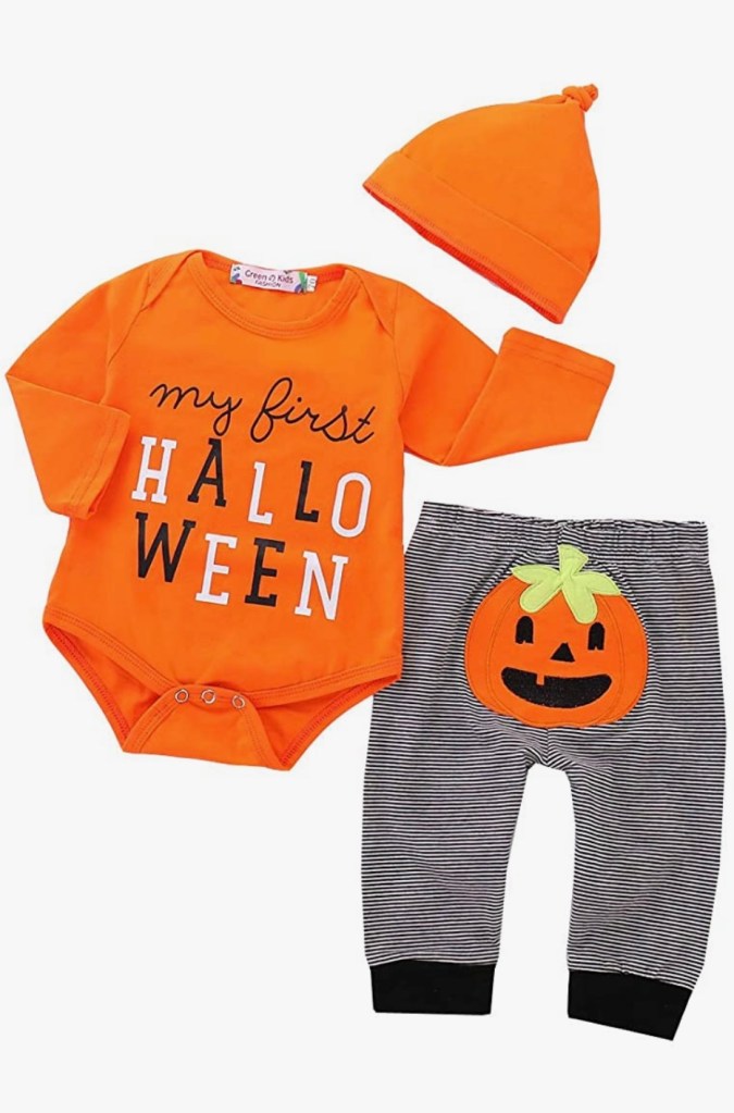 Of course, Brewer needed something that said, “Baby’s First Halloween.” Therefore, I did buy this cute little pants set because I loved the little pumpkin on the butt. It’s stretchy and comfy for baby. It’s also super affordable- only $13.98