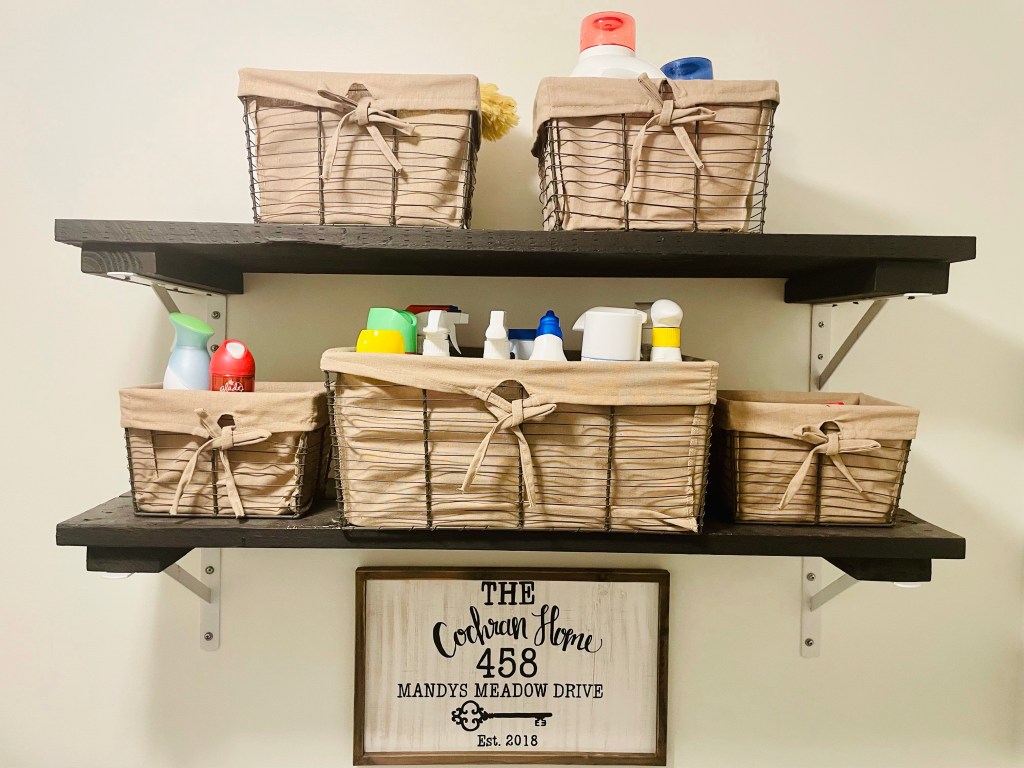 I keep all of the laundry room essentials in baskets that stay above the washer & dryer!