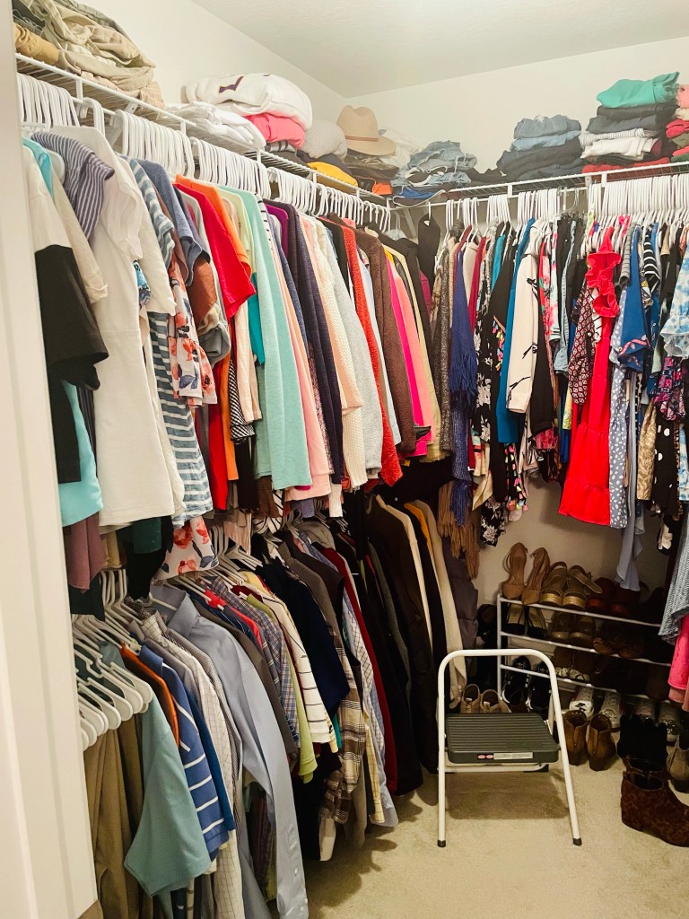 If you have a closet like this but still need more space, we added a bottom row on the left wall. Now we can hang two rows of clothes! We left the bottom of the back wall alone for shoe racks and longer hanging clothes like my dresses!