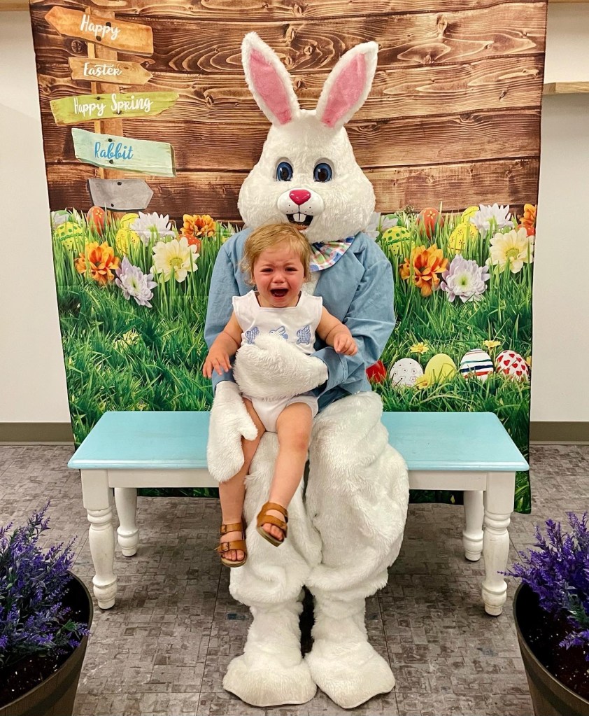 Then, we were off to Bunny Burg in our little town to meet the Easter Bunny! How will this go…