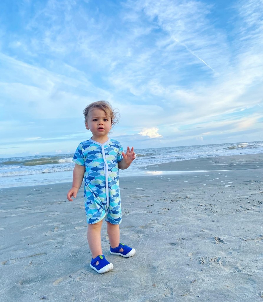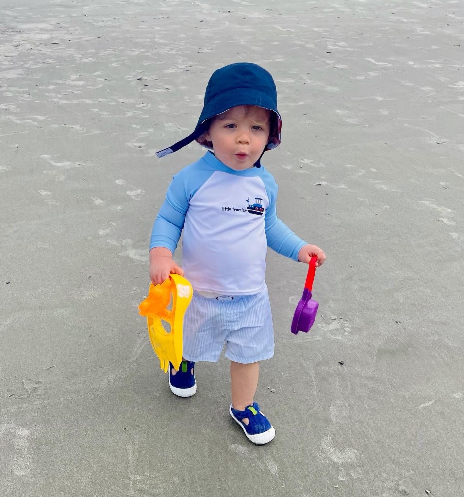We took him to the beach several times last summer but I think this trip, he really understood what was happening! He was playing in the sand, running back & forth down the beach, splashin’ in the water, and picking up seashells!