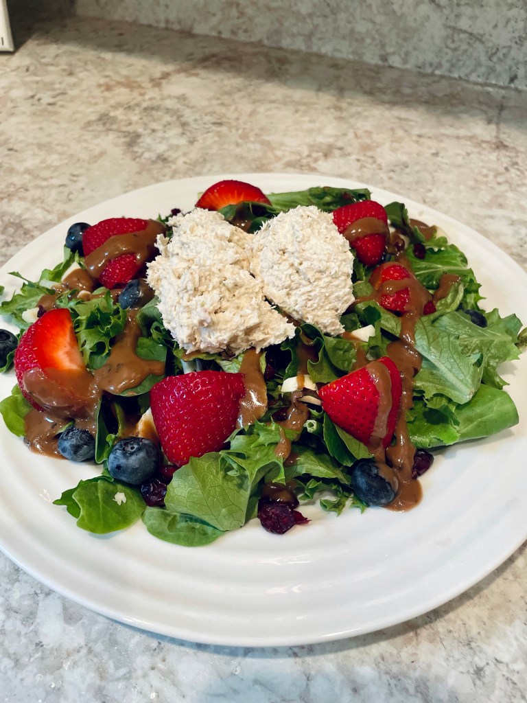 What’s on the Menu: I make this salad every summer and it is my absolute favorite!! We actually had it last night for dinner: spring mix lettuce, strawberries, blueberries. craisins, feta, balsamic, topped with chicken salad!