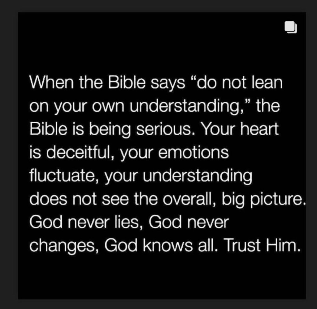 Have you ever pondered why God says, “do not lean on your own understanding.” This really hit me! God sees the big picture that we do not see. Our hearts can be deceitful. Our emotions can get the best of us. This is such an important reminder to truly lean on God’s understanding and not our own.