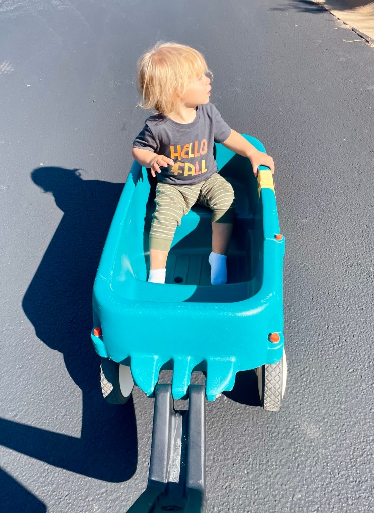 Yesterday, he threw his sock in the toilet before we went on this little wagon stroll.