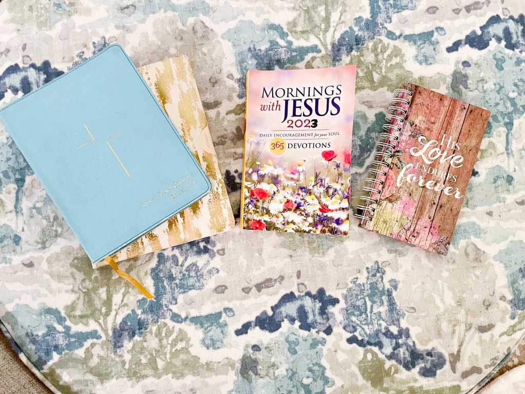On the left, I have my Bible and a journal where I write down scripture, sermon notes, or things I want to remember from my morning devotional, etc. In the middle, you’ll see my devotional. On the right, I have a prayer journal. I love writing down prayers! Especially when I tell people, I’m praying for them, I write it down so that I don’t forget!