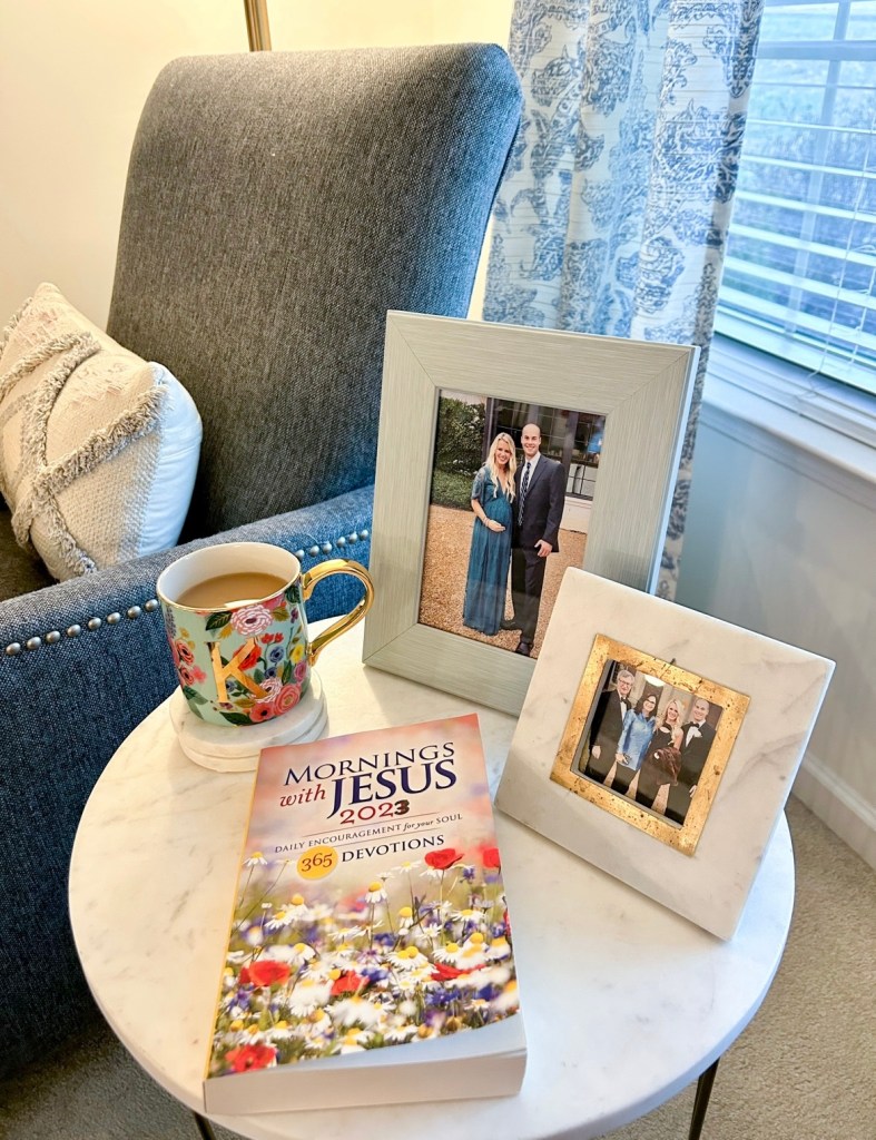 Sometimes I find a cozy spot inside and sometimes I go outside! This time of year is my absolute favorite for sitting outside on the back porch in nice weather, spending time with Jesus. I love being surrounded my His creation outside and hearing the stillness & quiet of the morning.