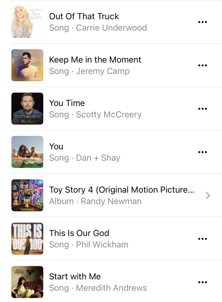 Listening to: It you open up my Apple Music, this is what you’ll find on my recent playlist.. a bit of country, a bit of Christian music, and the Toy Story soundtrack for Brewer! Lol
