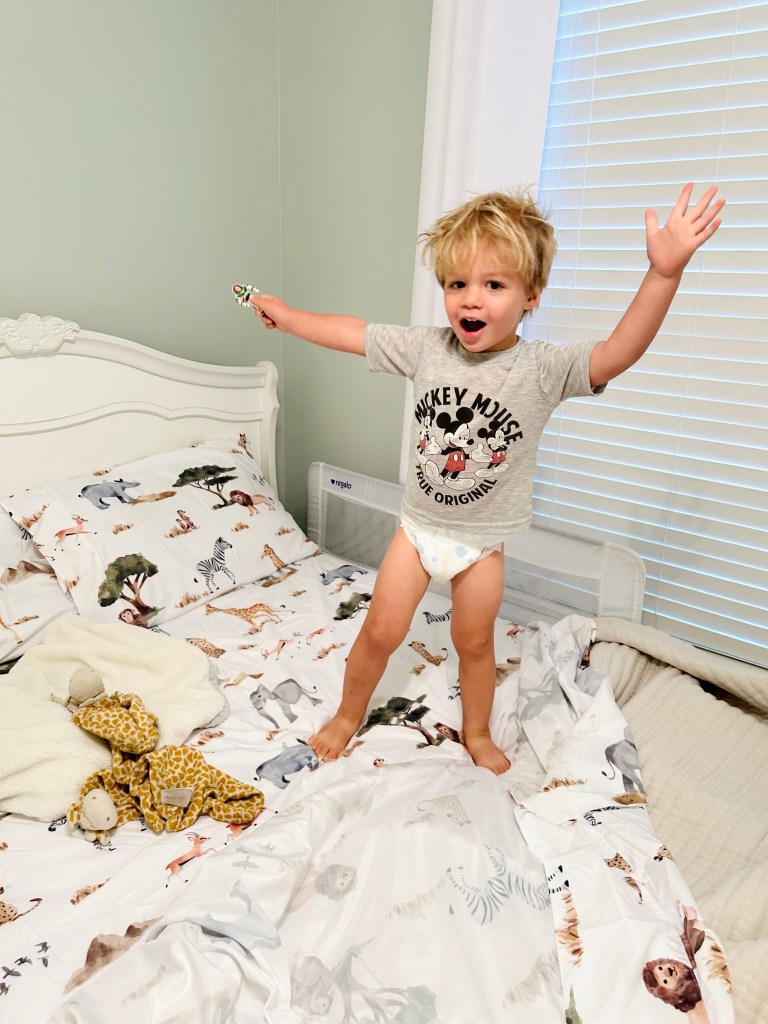 Now with this transition, comes little set backs that are to be expected. It’s taking longer for him to fall asleep at night but he’s continuing to get better each night. There have been a few nights over the past couple of weeks where he wakes up in the middle of the night. It’s kinda funny (& freaky) but when he wakes up, he walks out of his room and slams the door! Lol, it immediately wakes us up. One of us will go lay with him until he goes back to sleep!