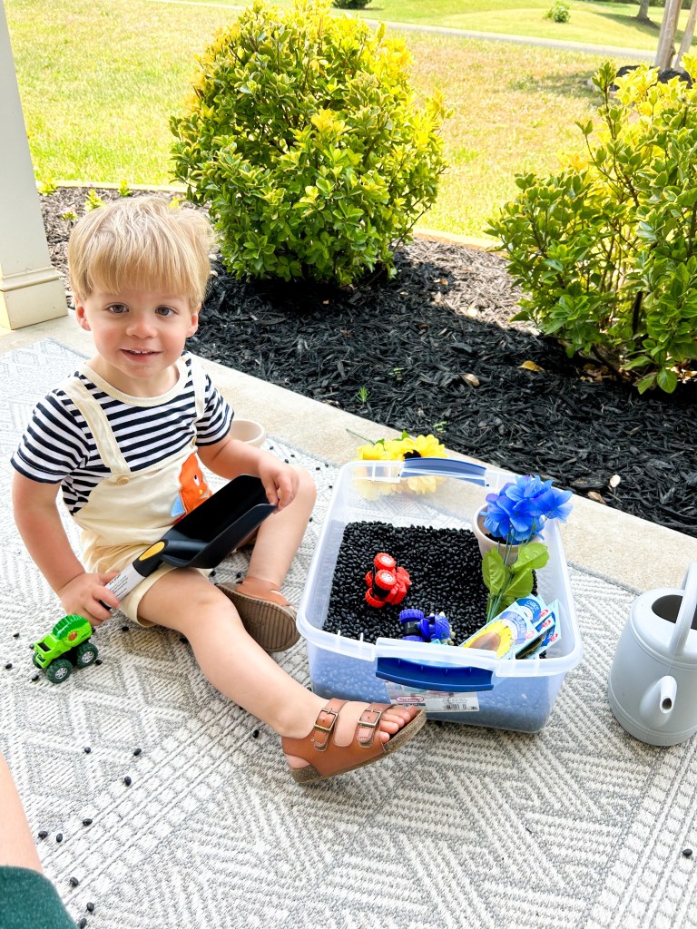 Brewer & I made our own garden sensory bin this summer.