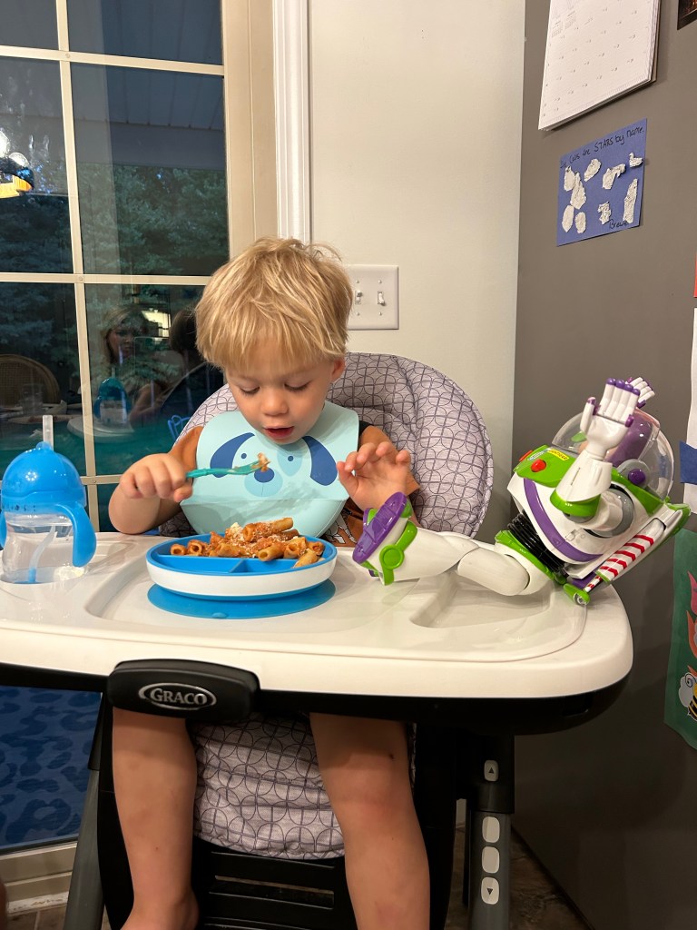I snapped this photo recently at dinner. Brewer only wanted to sit in his high chair if Buzz could sit with him. Lol, toddlers are fun!