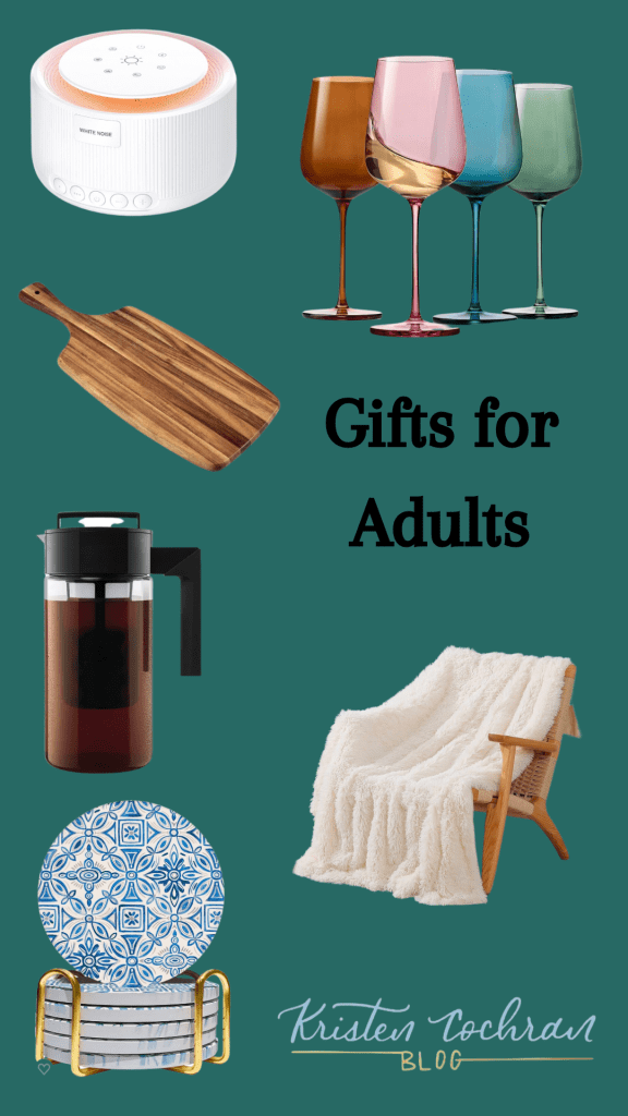 All of these items are perfect for any adult: a white noise machine for travel or at home (yes please), fun colorful wine glasses, charcuterie board, cold brew coffee maker (y’all know I love this!), coasters, and everyone loves a new soft throw blanket!