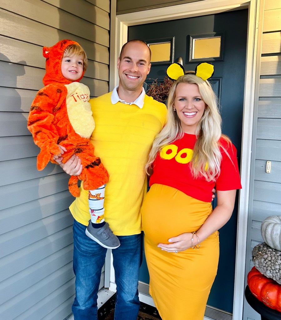 Halloween night, I got to pull out the “Pooh Bear” costume again! Some of y’all may remember that I wore this exact same costume while pregnant with Brewer! This time around, we added our very own Tigger and Christopher Robin!