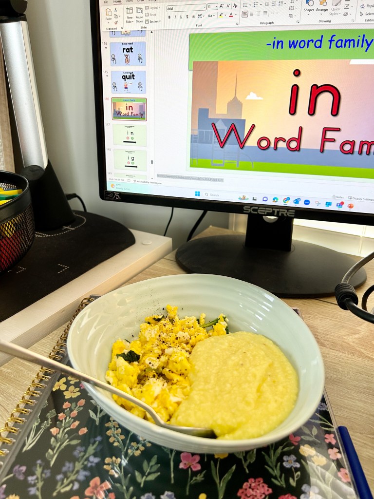 I began teaching at 8:30. Harry came home after dropping Brewer off & made breakfast: eggs with spinach & grits. I can get use to him being on paternity leave. Haha.