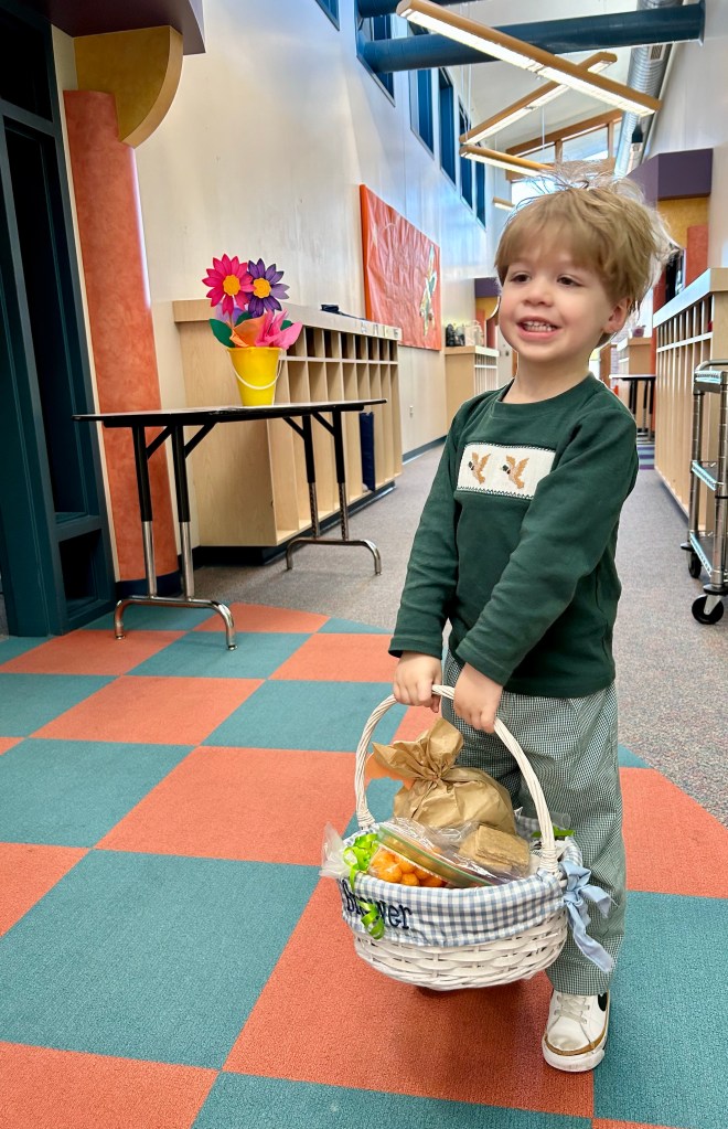 Then, Harry left to take Brewer to school. He attends a week day church program and they were having an Easter egg hunt & party on this day! Finding these pre- stuffed eggs felt like a mom win, lol.