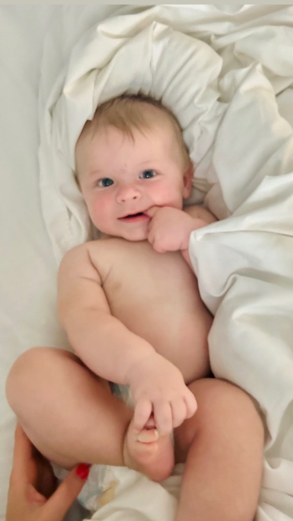He doesn’t have any teethies yet but we think we’re maybe getting close? He drools a lot and likes to chew. There was one night he woke up but he immediately started self soothing by putting his hand in his mouth, then went right back to sleep. I mean.. just an angel baby.