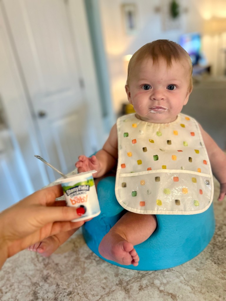 He’s eating baby yogurt + baby oatmeal + all the purées! He eats like a champ.. clearly, lol. #chunkymonkey