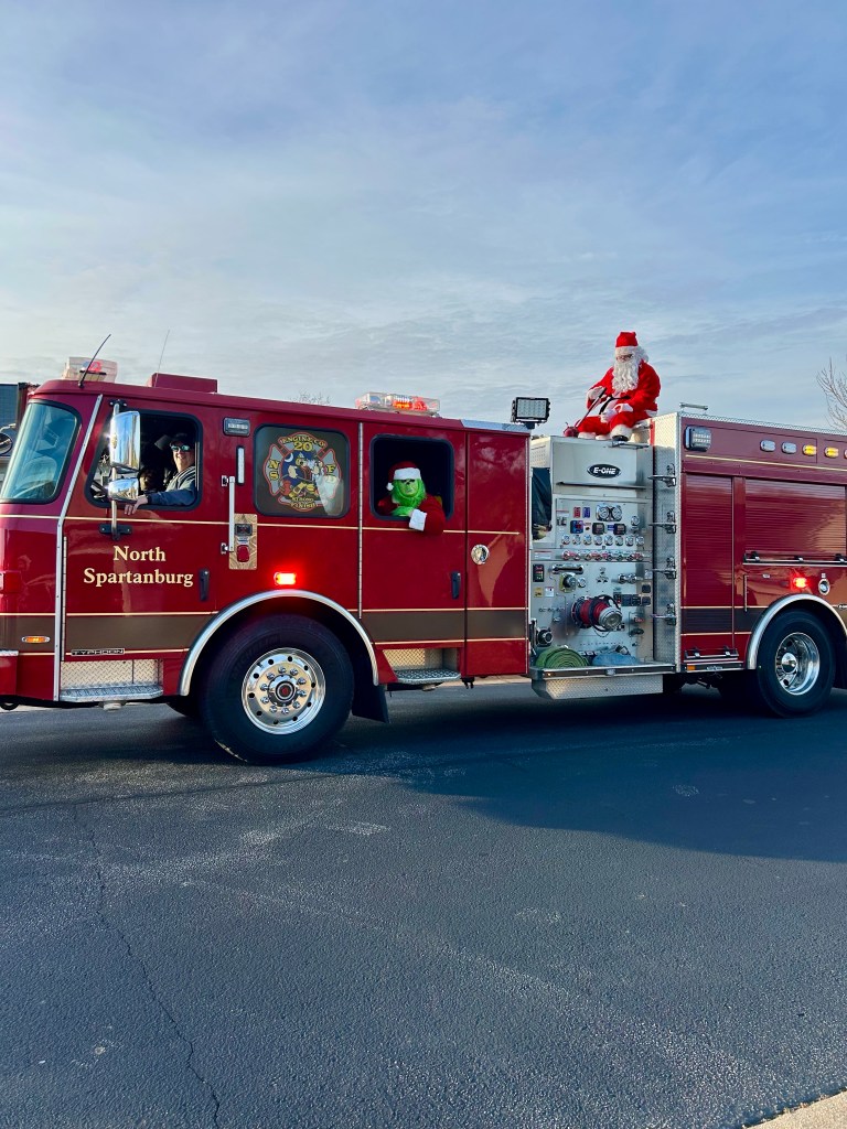 This was so fun! We had a visit from Santa and the Grinch come through our neighborhood on a fire truck. This made Brewer’s day.. until the Grinch stuck his head out the window. lol