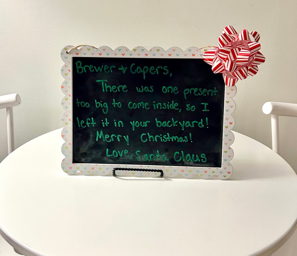 After reading the note from Santa, Brewer flew to the back door, with Capers following him! We threw on jackets + shoes and outside we went!
