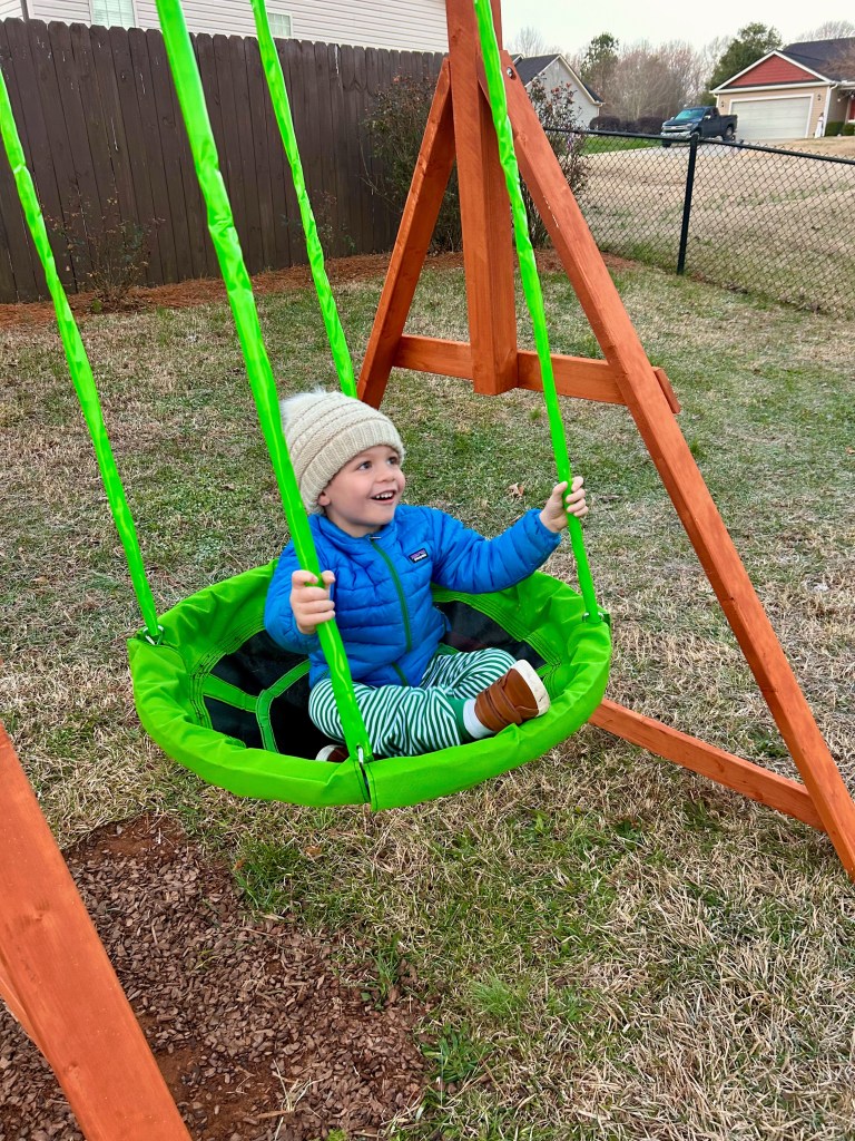 When the boys were fast asleep, we stepped outside and took away a tarp that was covering this.. the boys’ very first swing set 🥹
