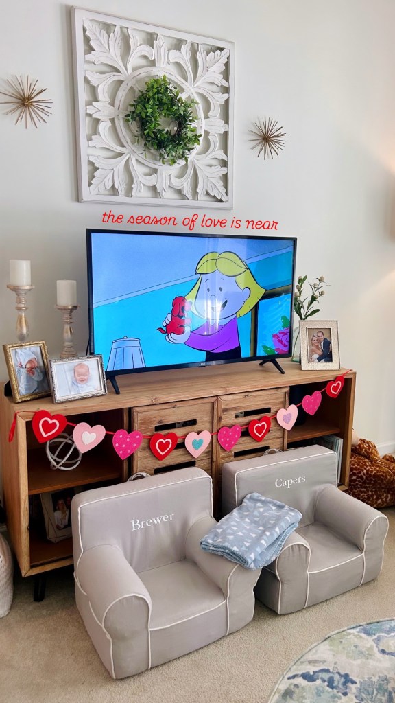 –Decorate: This always gets me in the spirit! Plus, my kids love it! This can be super simple, nothing elaborate. My boys got excited to see the $5 valentine banner from Target in our living room this year!