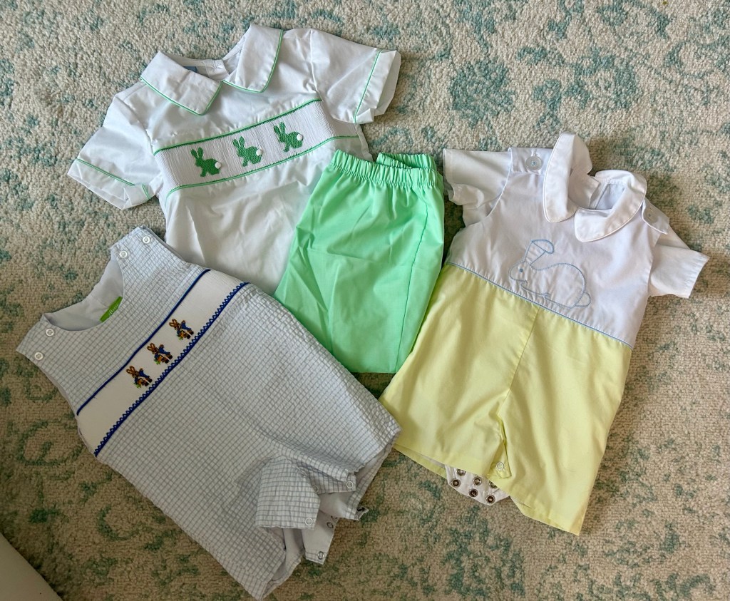 For Easter this year, Brewer is wearing the short set in the middle. Capers will wear either the romper on the left or the right. I’m still undecided lol. Both of those were Brewer’s!