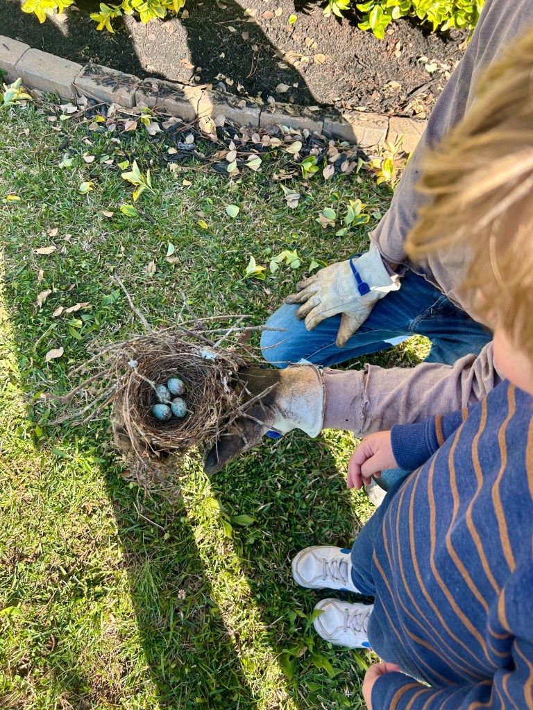The boys found a birds nest that had fallen out of a tree in our yard! We were able to nestle it back into the tree.