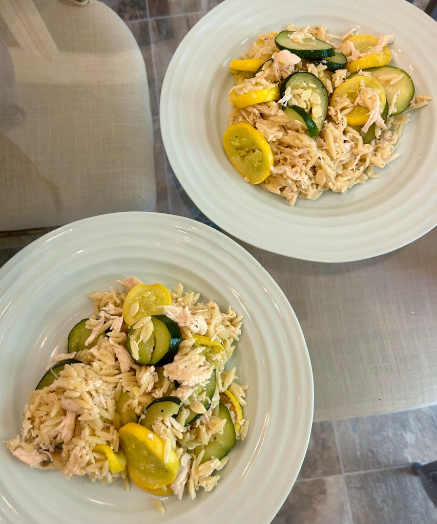 What’s on the Menu: We came home from vacay to lots of veggies in the garden. I made a lemon shredded chicken orzo pasta with the veggies we grew! We had that the past two nights and Harry is grillin’ tonight. 🙂