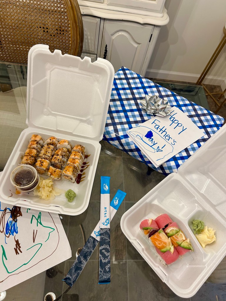 We left for the beach on Father’s Day, so we celebrated our favorite guy the night before heading out of town with sushi take- out, homemade cards, and presents (shirts for the beach! 😉)