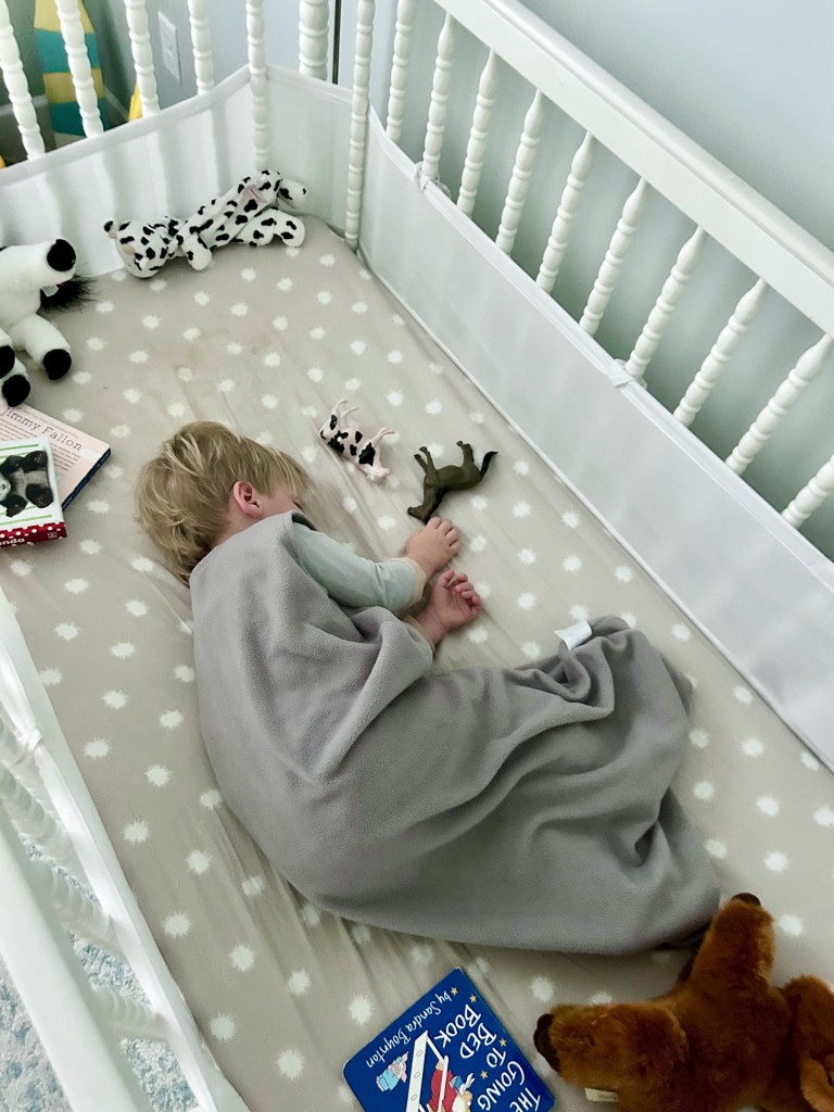 He has no problem going to sleep but he better have all his important things. He loves a crib full of stuff and he will tell us exactly which stuffed animals and books he wants.